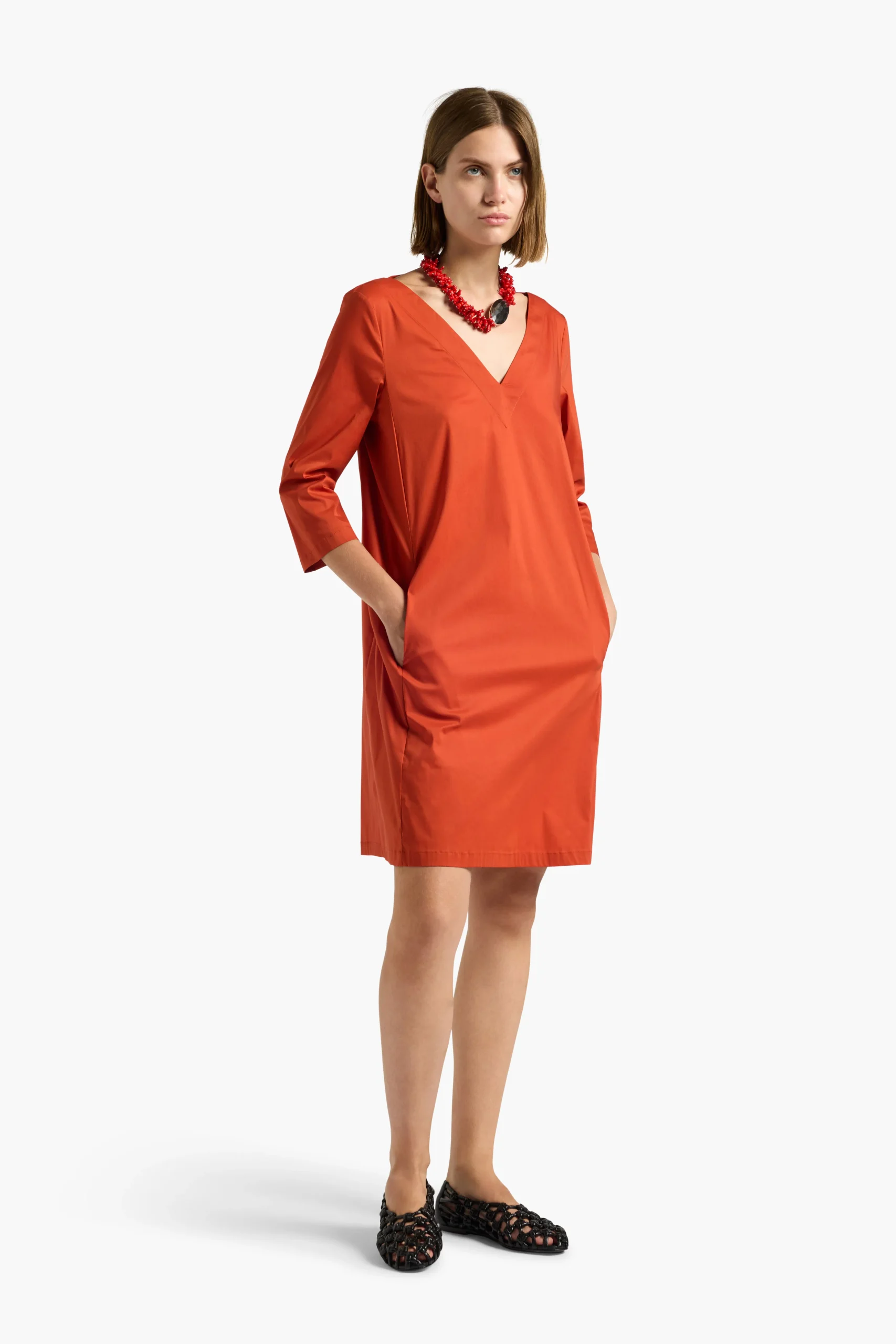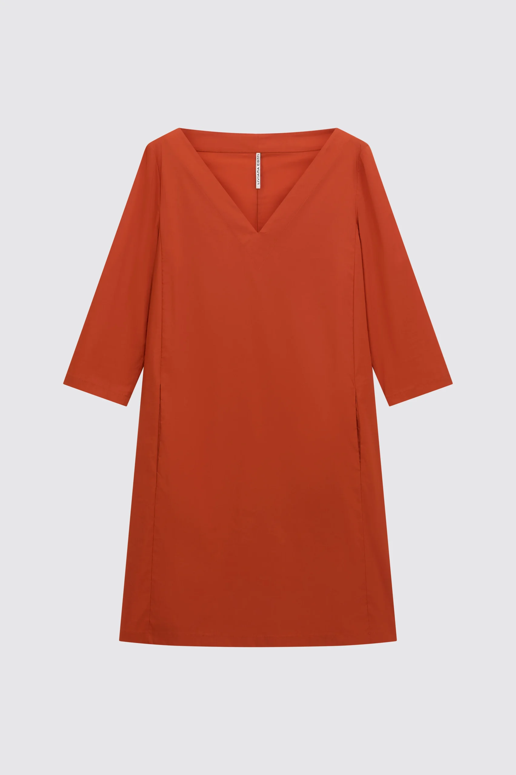 L’ Abito Angeline LIVIANA CONTI, è un abito corto scollo a V in popeline stretch, maniche a tre quarti, tasche nascoste. Linea dritta e pulita.