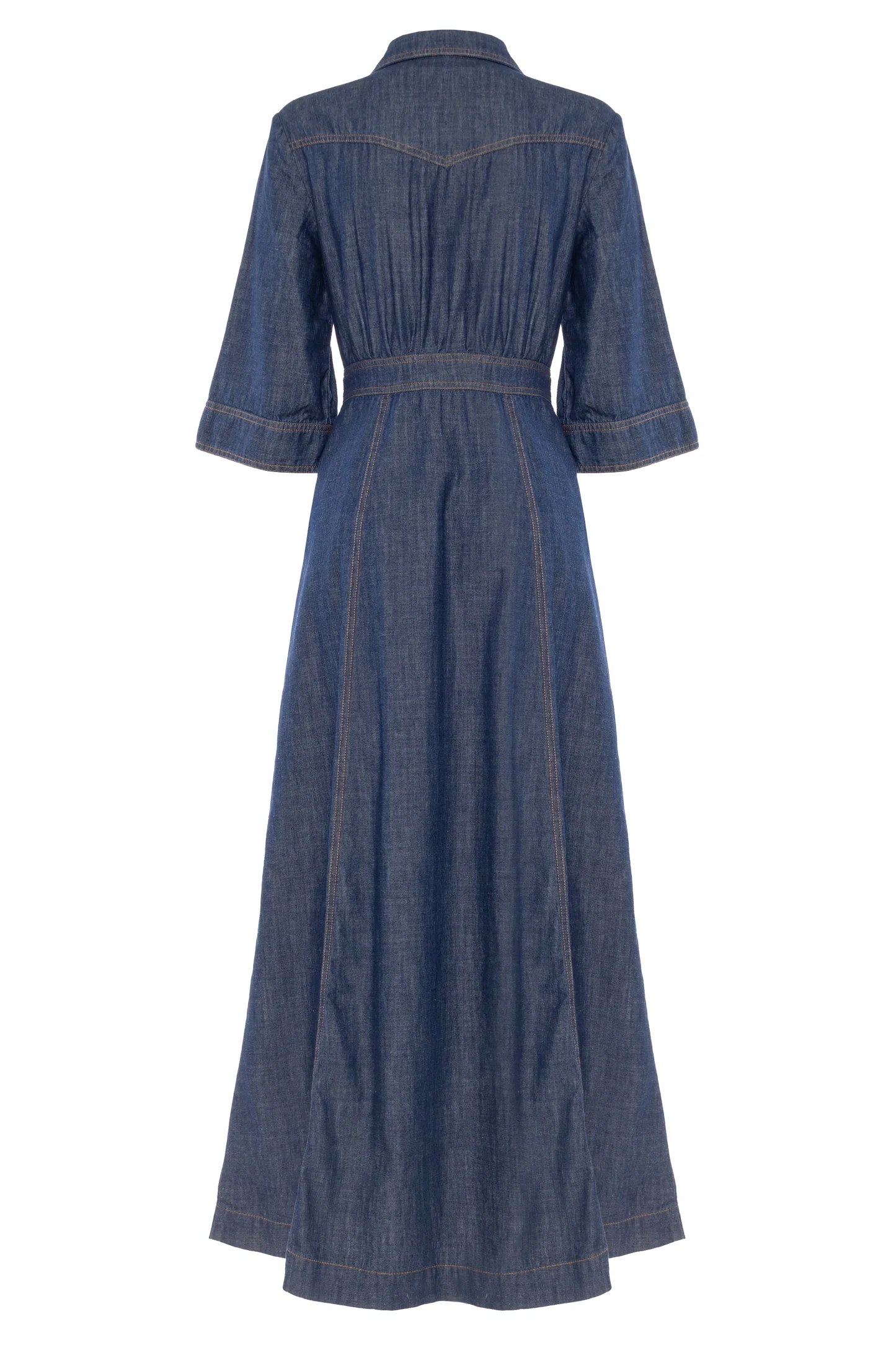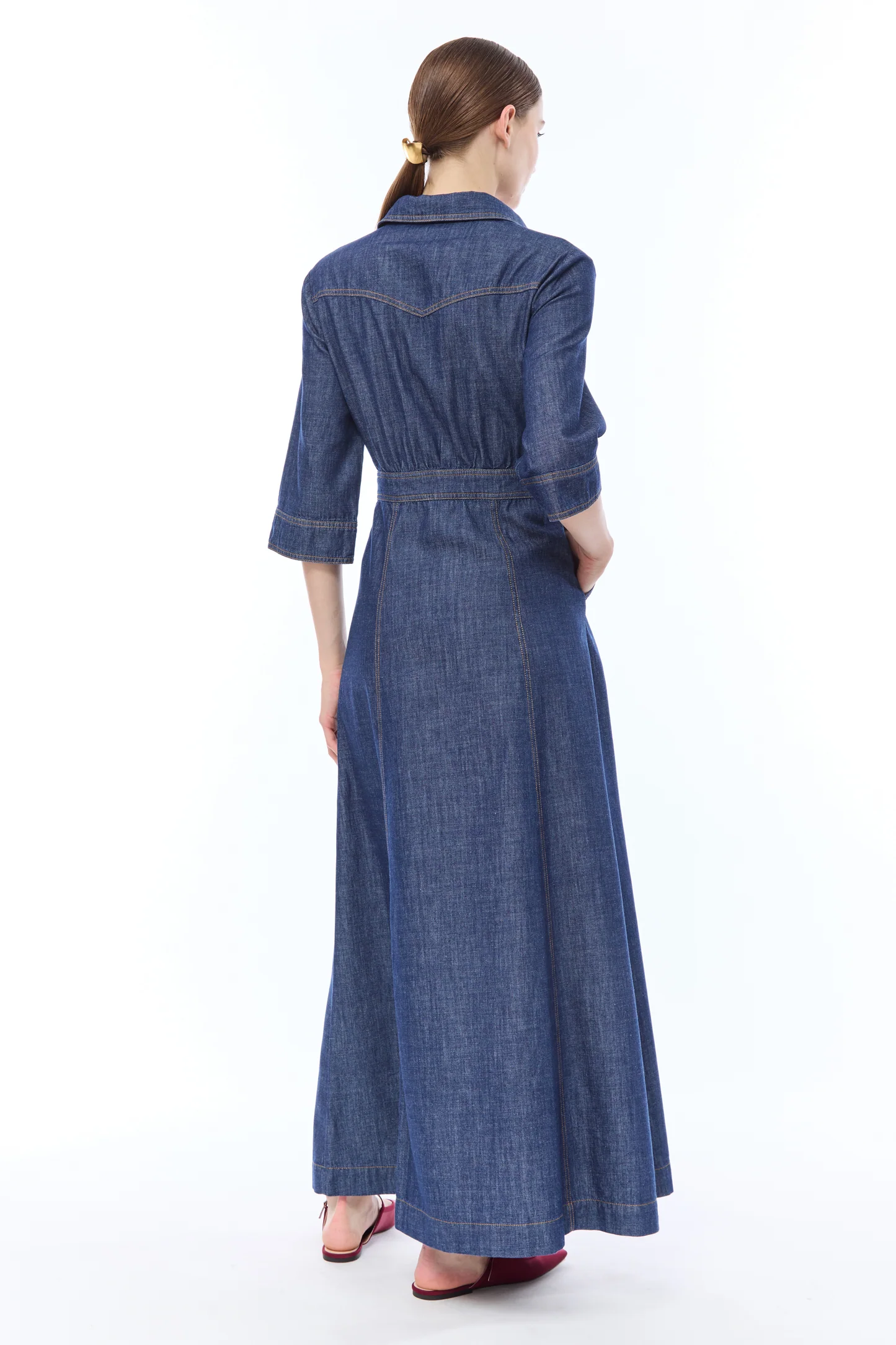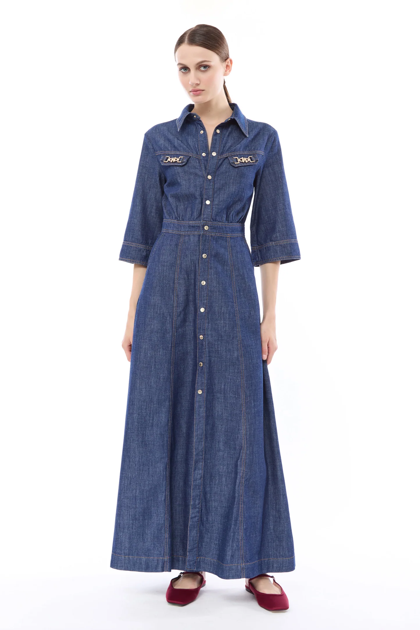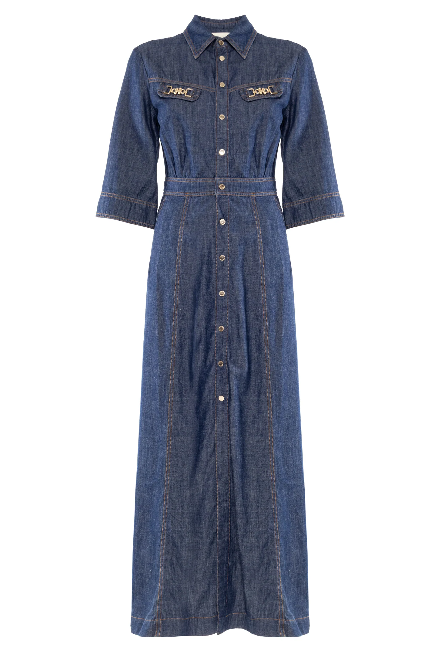 L’ Abito Denim Summer NENETTE, è un abito chemisier lungo in denim definito da una silhouette femminile con punto vita segnato e gonna svasata. Il design presenta un classico colletto a punta, maniche a tre quarti e una chiusura frontale con bottoni dorati. Taschini applicati sul petto con dettagli gioiello e cuciture a contrasto rifiniscono il capo con un tocco sartoriale.