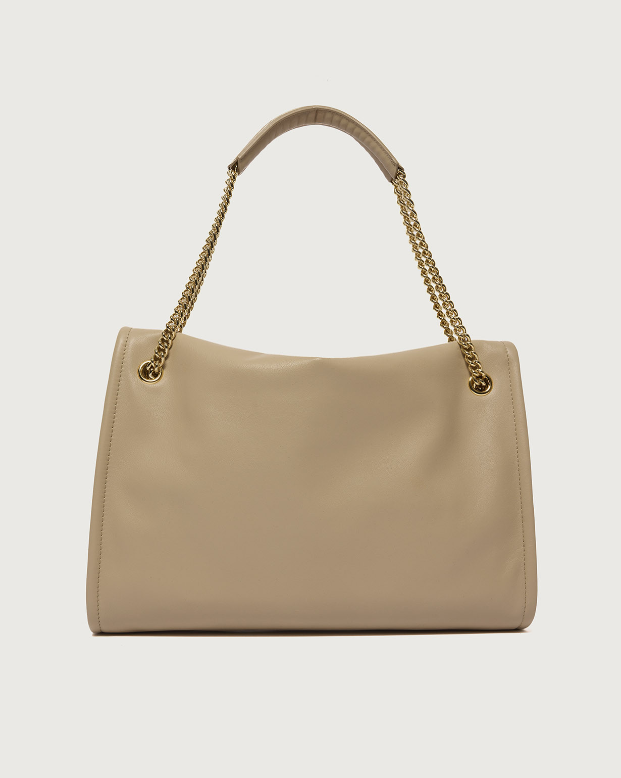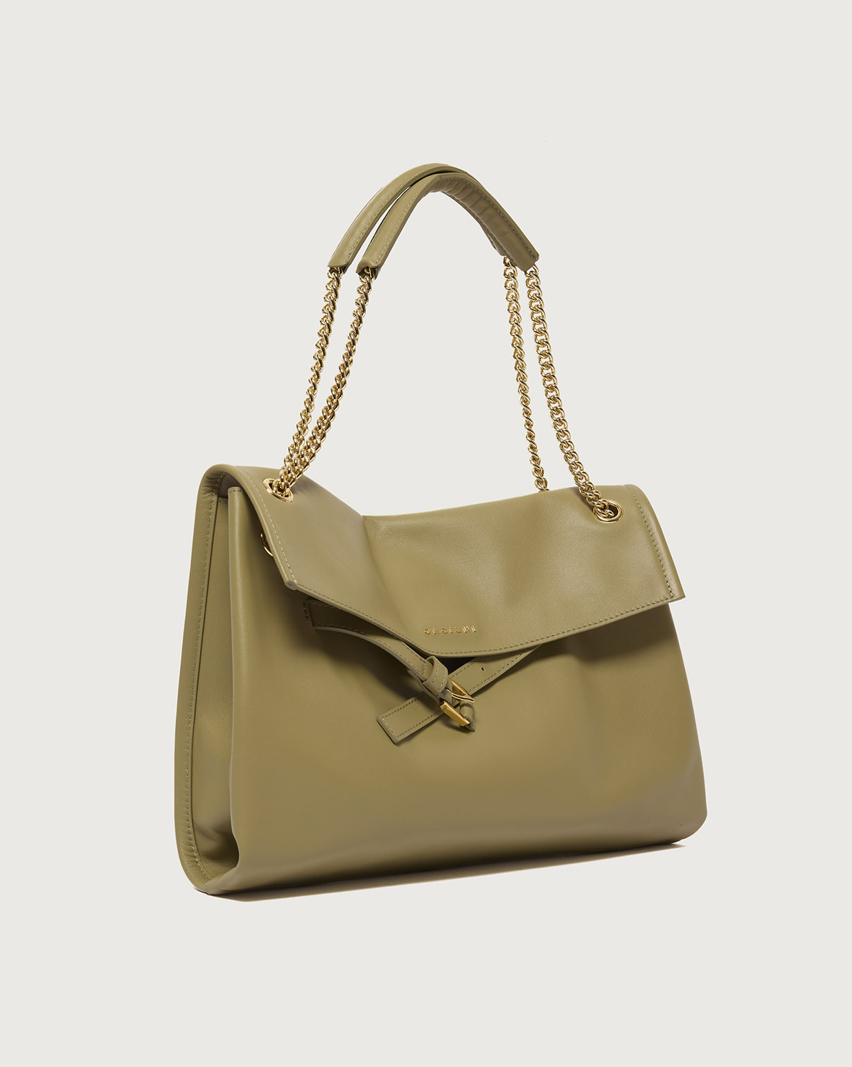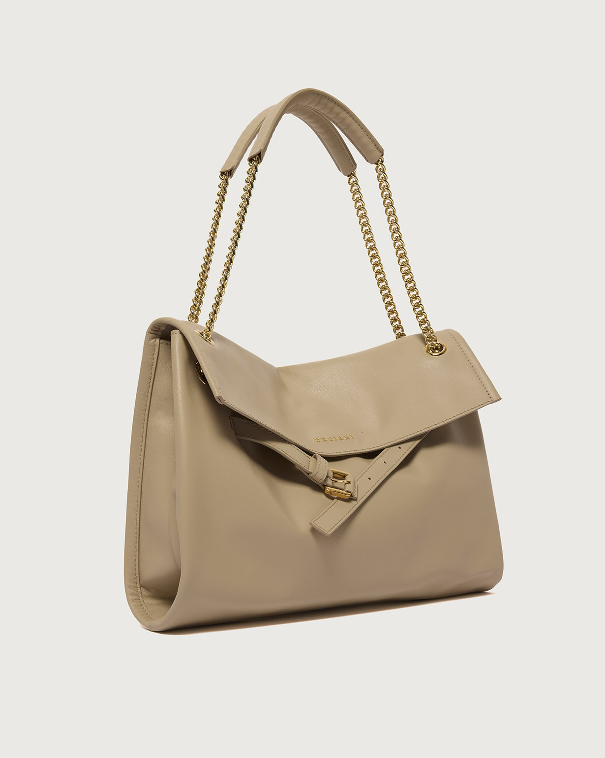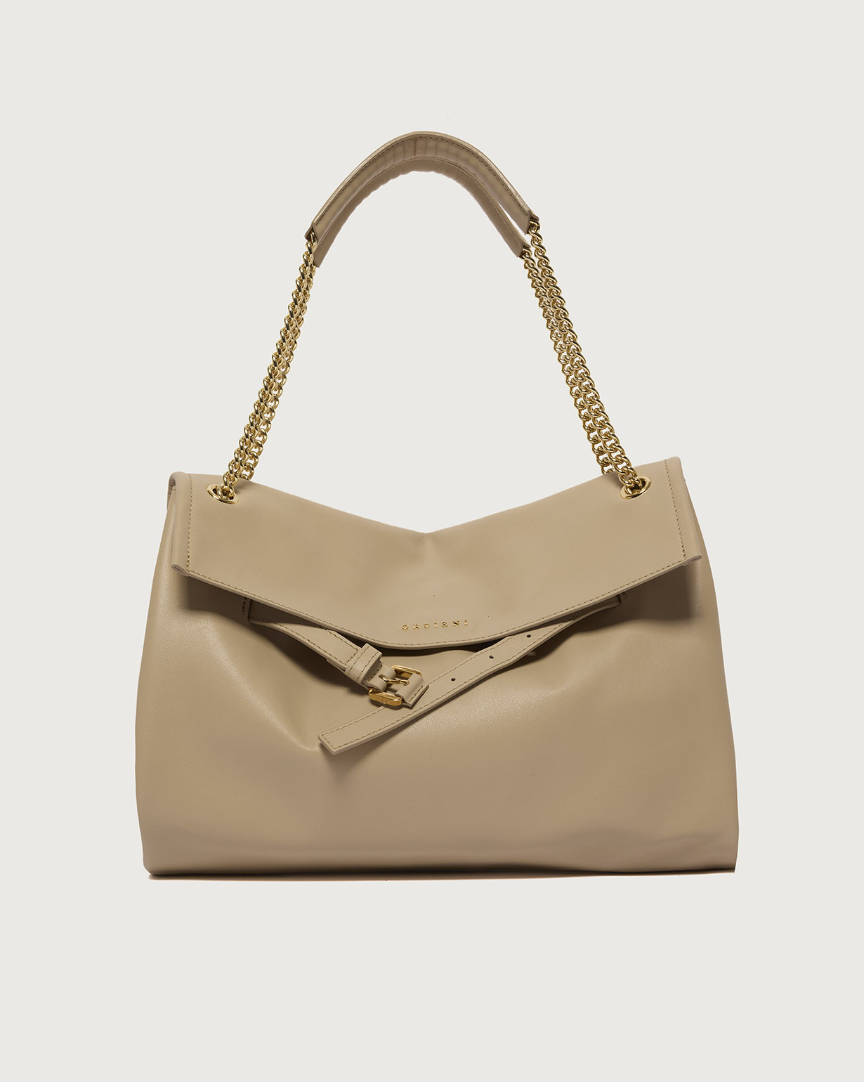 La Borsa Venus Nappa Midi ORCIANI, una borsa dalle forme morbide e il design strutturato, perfetto trait-d’union fra passato e futuro, una continuità di valore arricchita di contenuti nuovi, contemporanei, come il dettaglio della cintura slacciata, la forma allungata (east – west) e la tracolla catena.