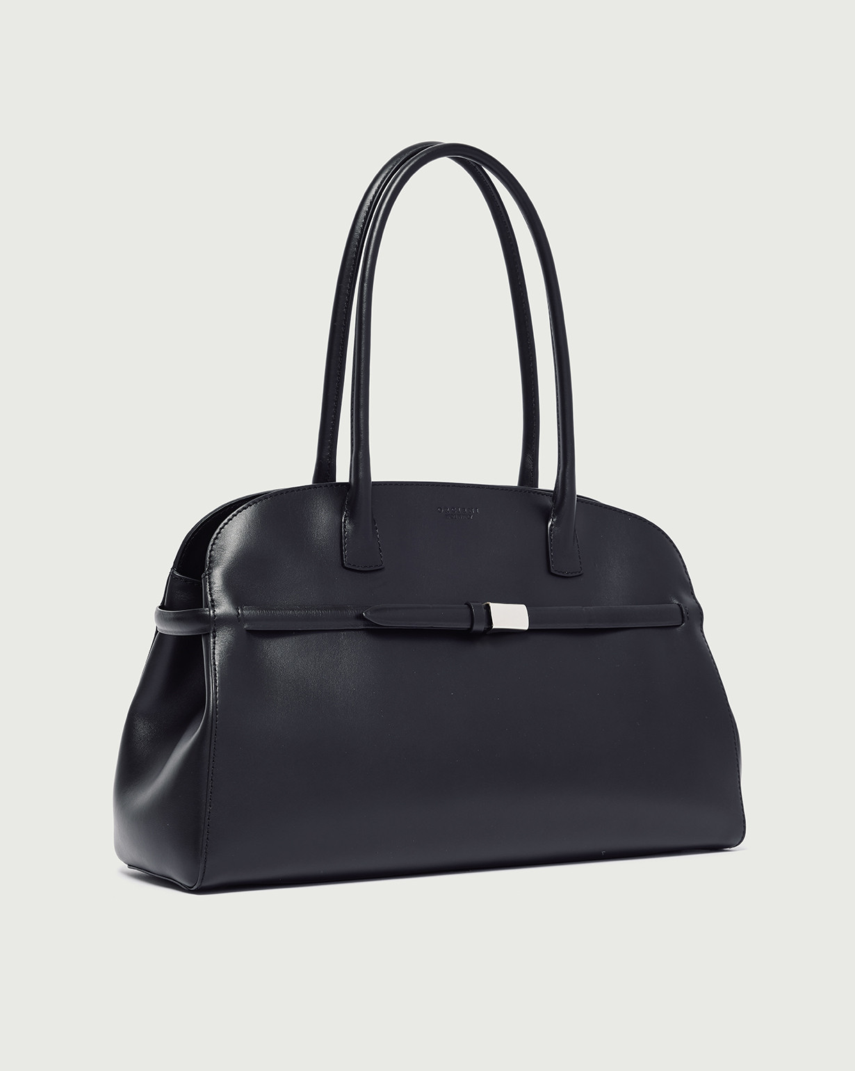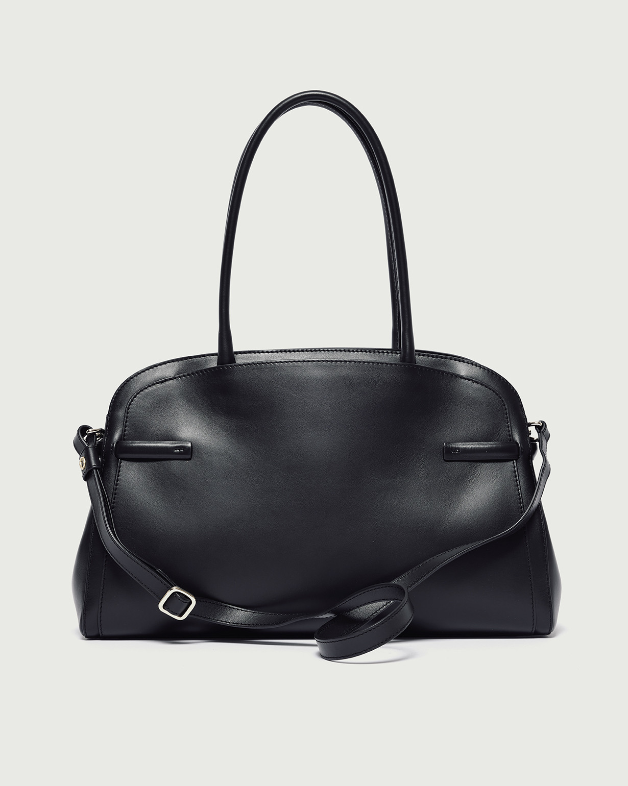 Aura Alba Large è una borsa a spalla in pelle liscia, una creazione dalle curve rotonde e il carattere seducente.