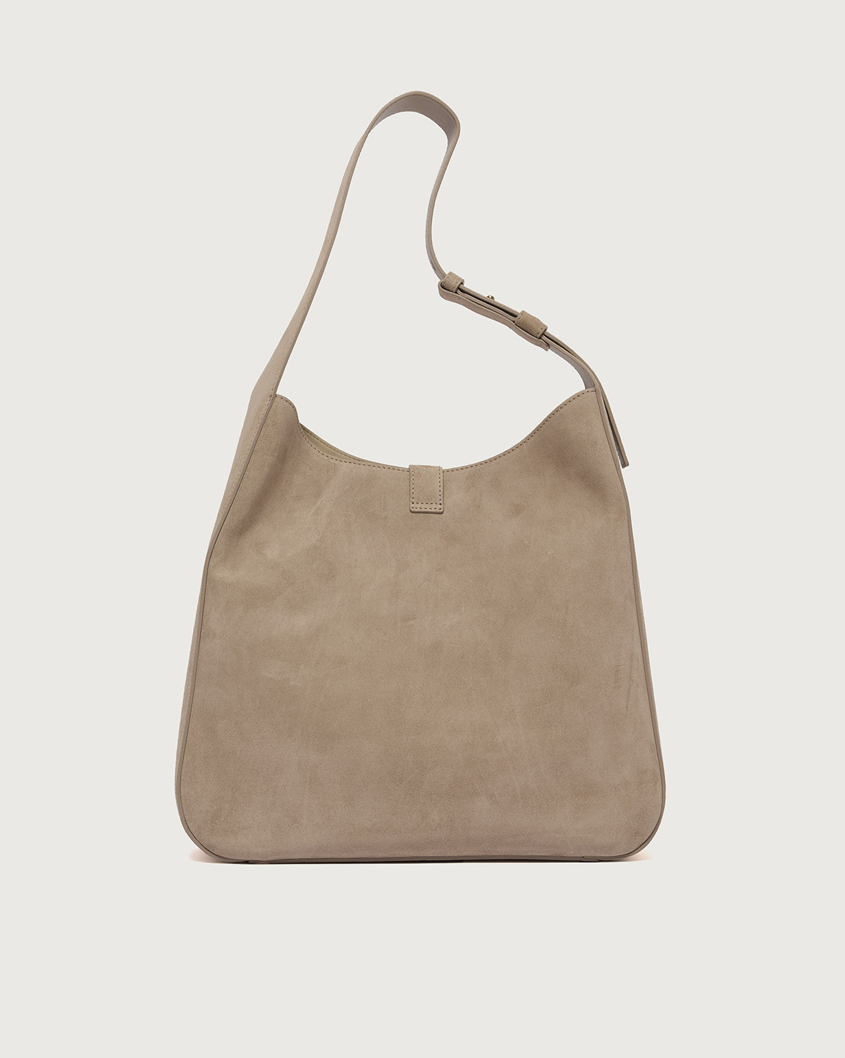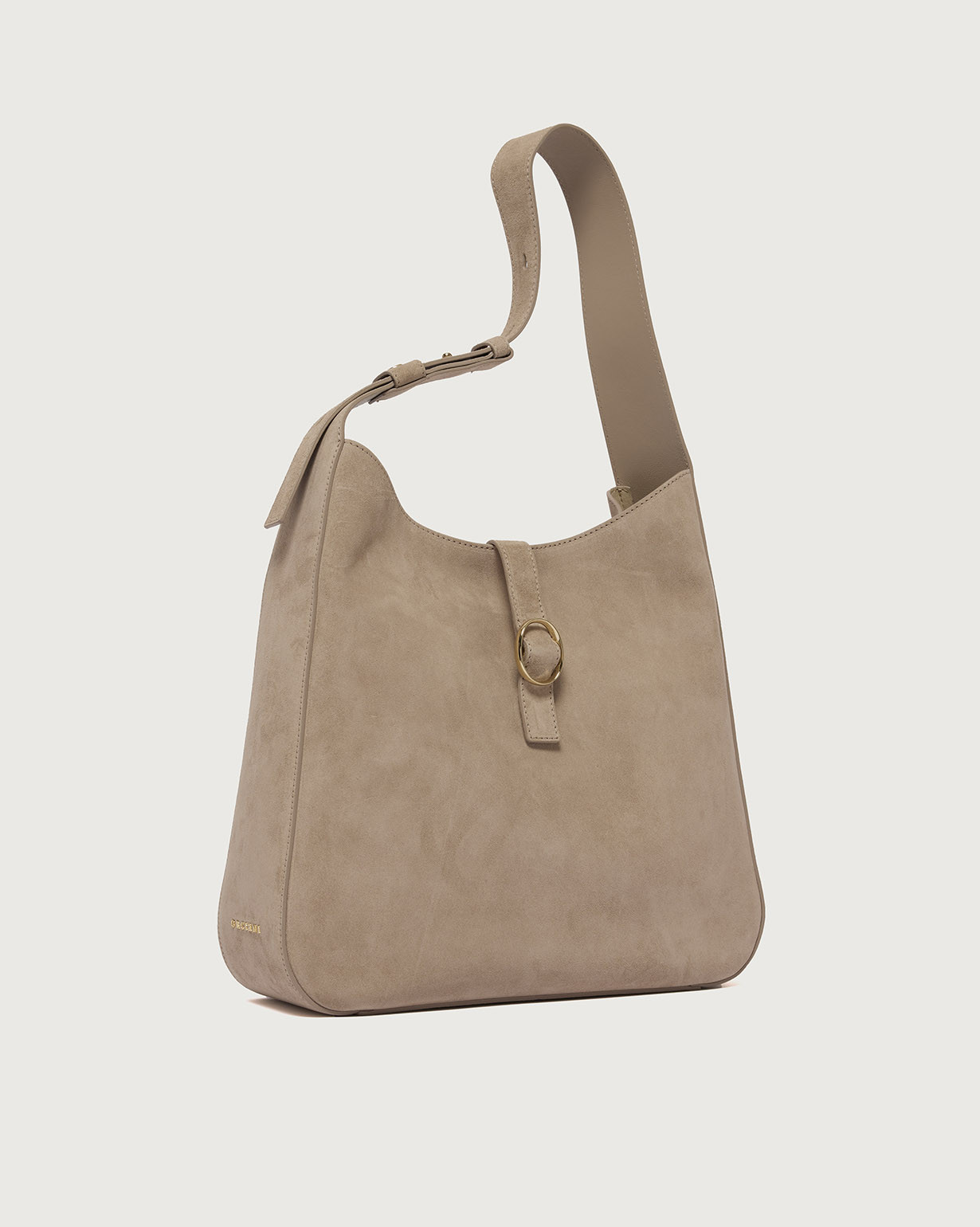 La Borsa Gea Peach ORCIANI, è una borsa a spalla in pelle scamosciata con manico regolabile, chiusura a fascetta con bottone magnetico, internamente due taschini di cui con zip. Finiture in oro chiaro.