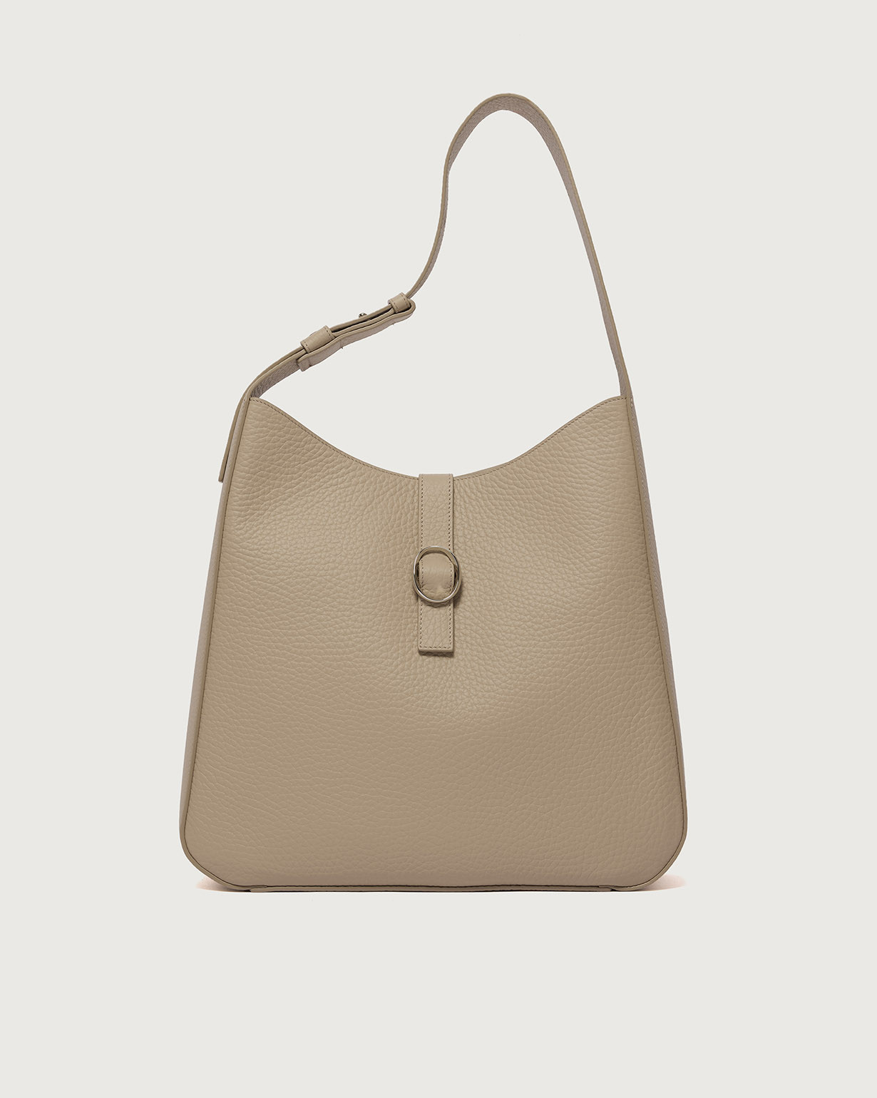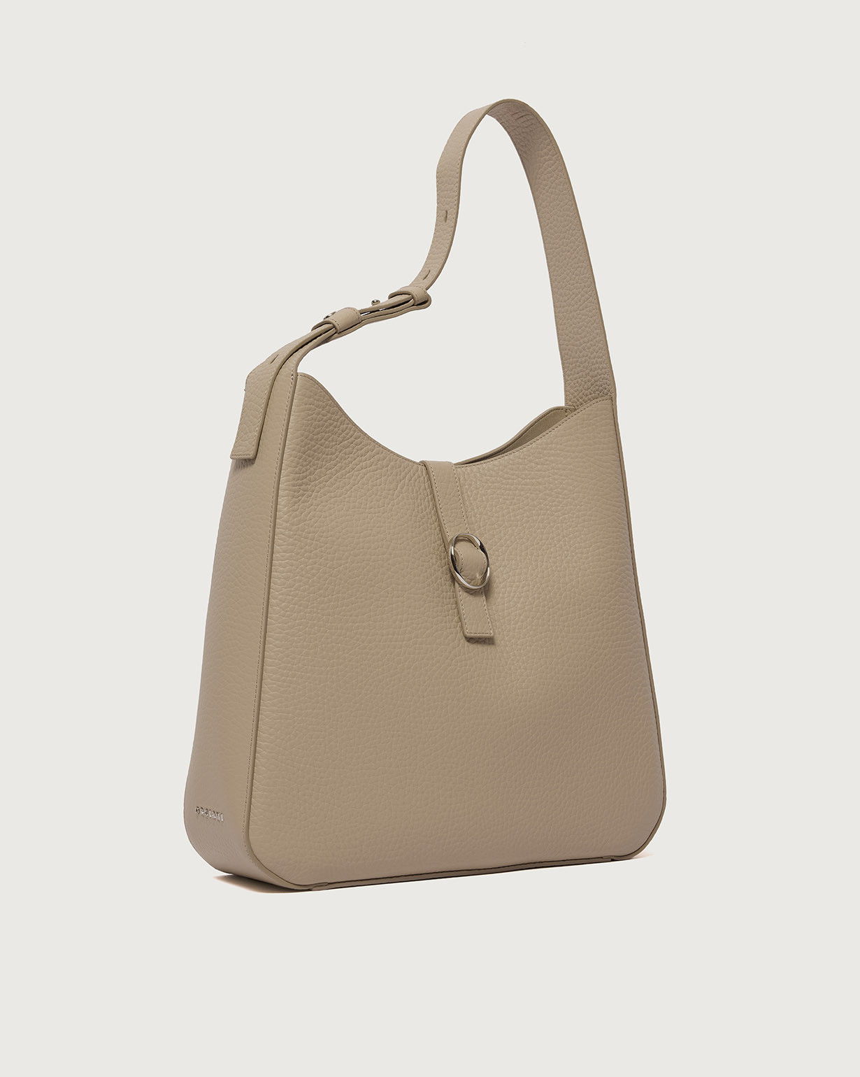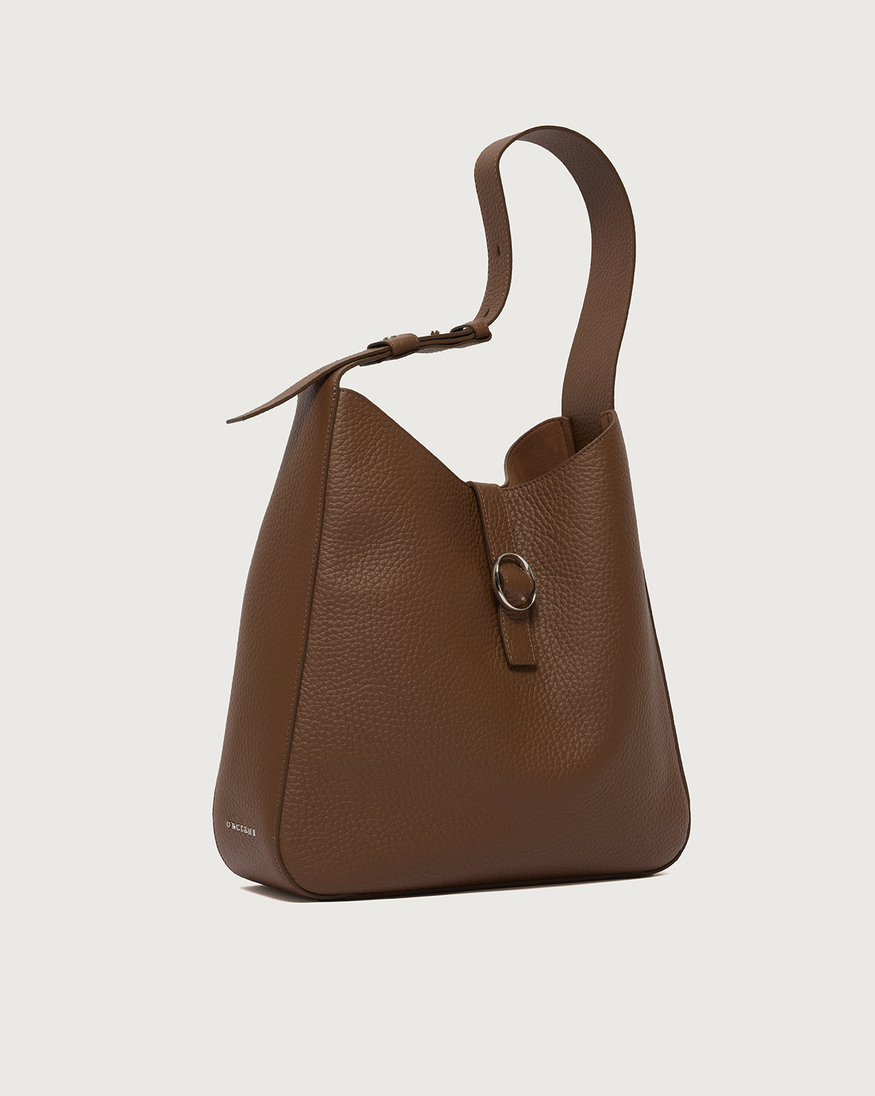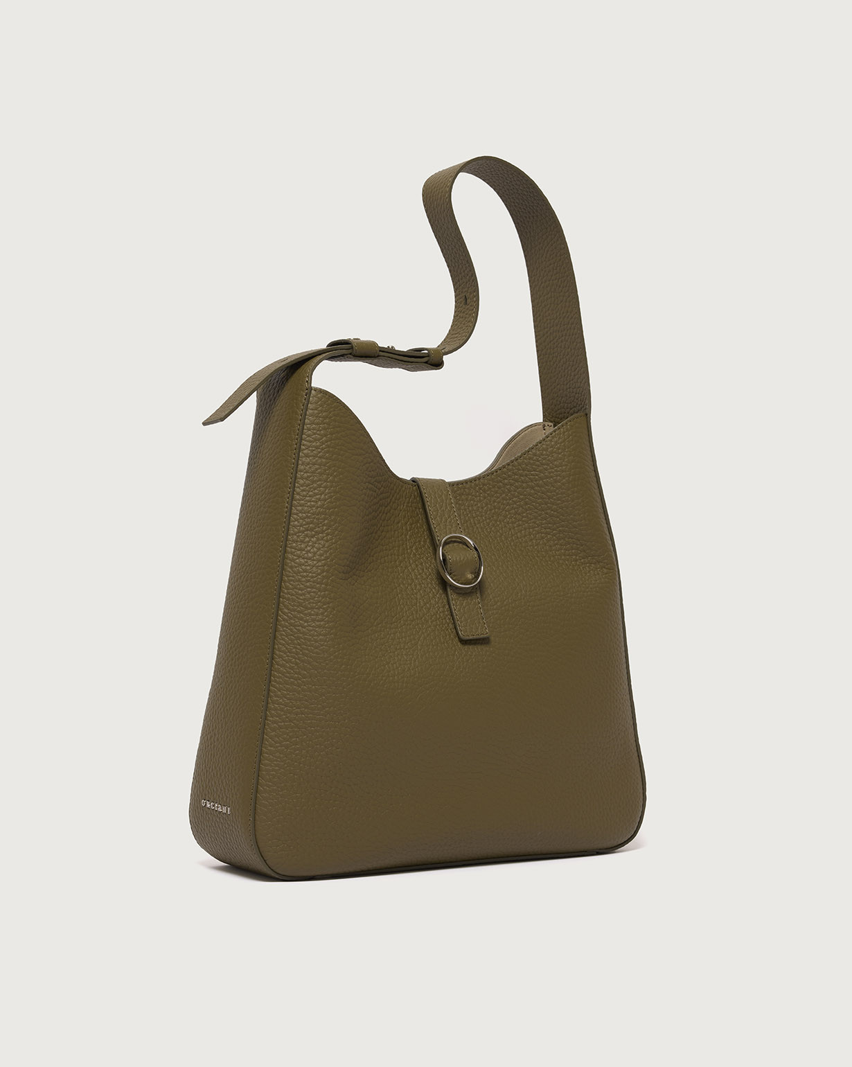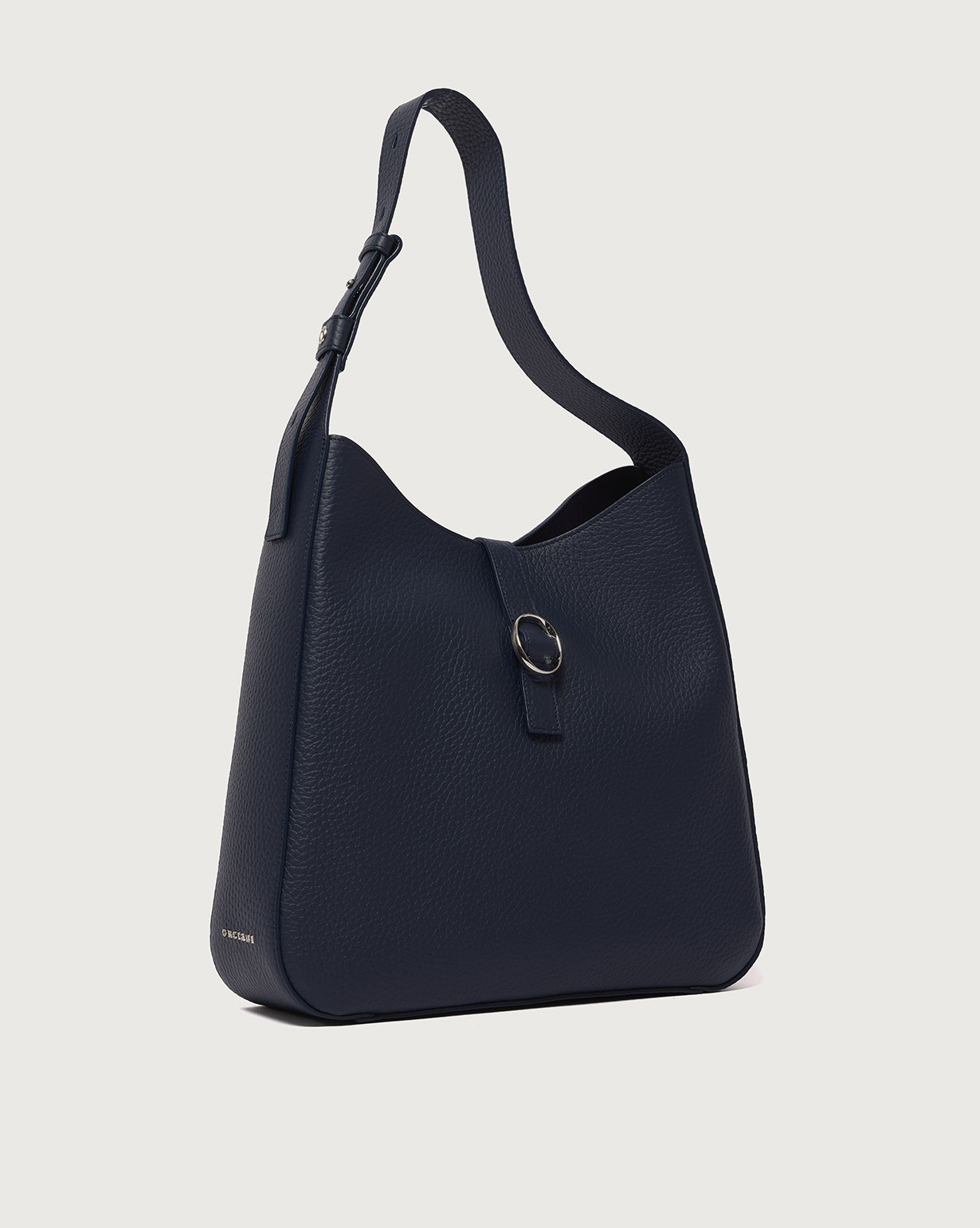 La Borsa Gea Soft ORCIANI, è una borsa a spalla in pelle martellata con manico regolabile, chiusura a fascetta con bottone magnetico, internamente due taschini di cui con zip. Finiture palladio.