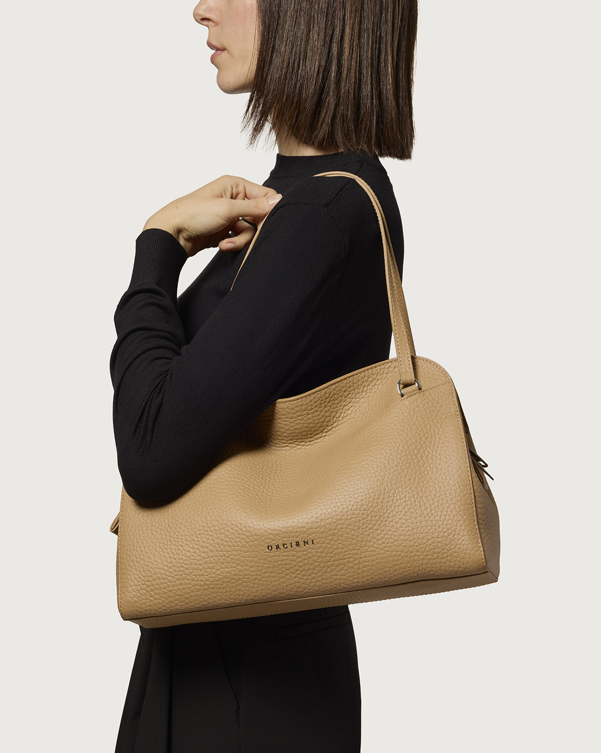 La Borsa Lido Soft Midi ORCIANI, è una borsa a spalla in pelle martellata con tracolla, chiusura a doppia zip, tasche interne con una a zip.