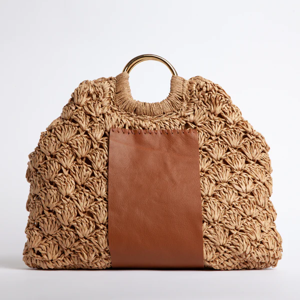 Borsa in rafia foderata in cotone caratterizzata da una fascia centrale cucita e ricamata a mano in pelle liscia di vitello con etichetta in pelle laserata e finiture oro. Bottoni magnetici laterali per effetto a soffietto e chiusura centrale con cerniera in metallo. Manici ad anello in metallo con logo Àlmala, tracolla removibile in tessuto regolabile.