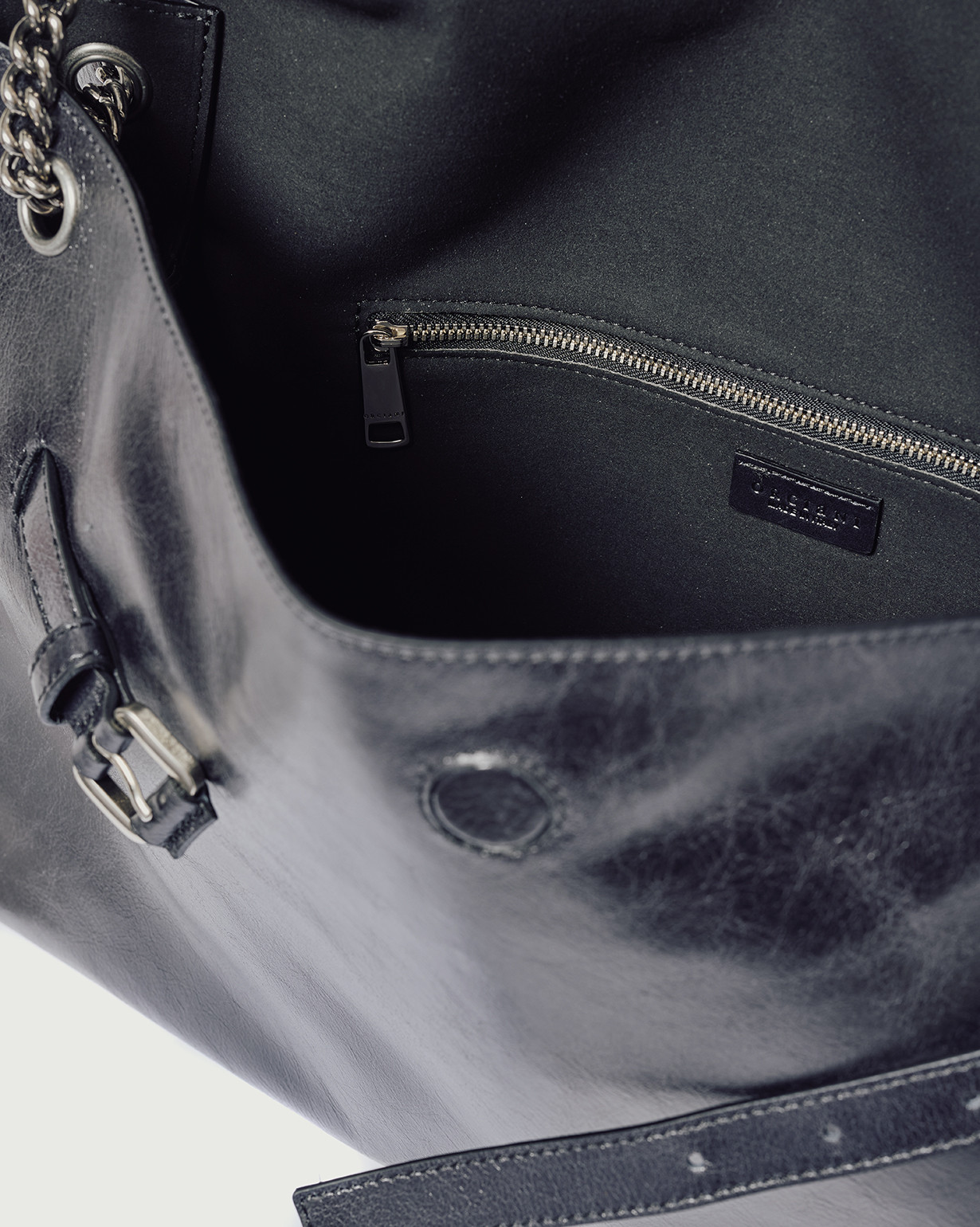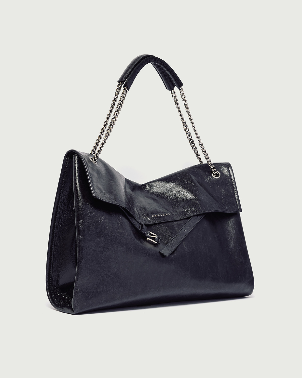 Borsa Venus Gotham Large ORCIANI, una borsa dalle forme morbide e il design strutturato, perfetto trait-d’union fra passato e futuro, una continuità di valore arricchita di contenuti nuovi, contemporanei, come il dettaglio della cintura slacciata, la forma allungata (east – west) e la tracolla catena.
