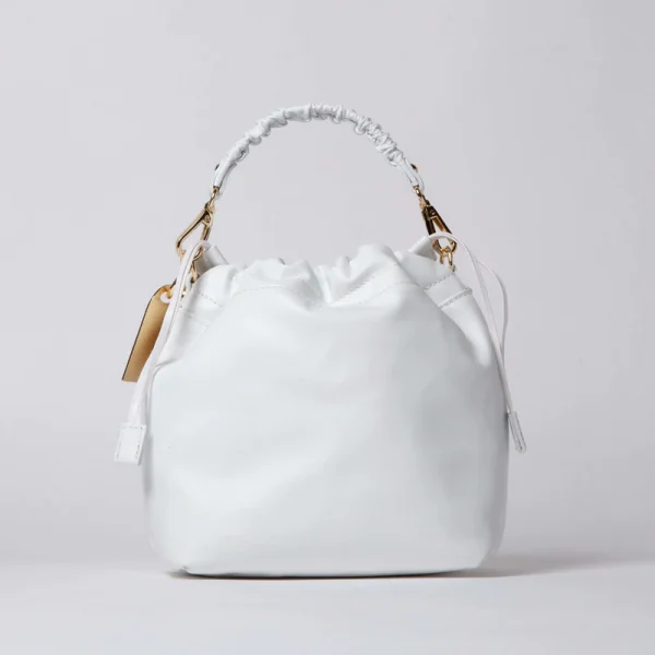 Borsa in pelle di vitello liscia, manico in pelle goffrata, tracolla in pelle removibile e regolabile. Tasca frontale con chiusura a bottone, ampia tasca interna con cerniera in metallo. Chiusura a coulisse, finiture oro.