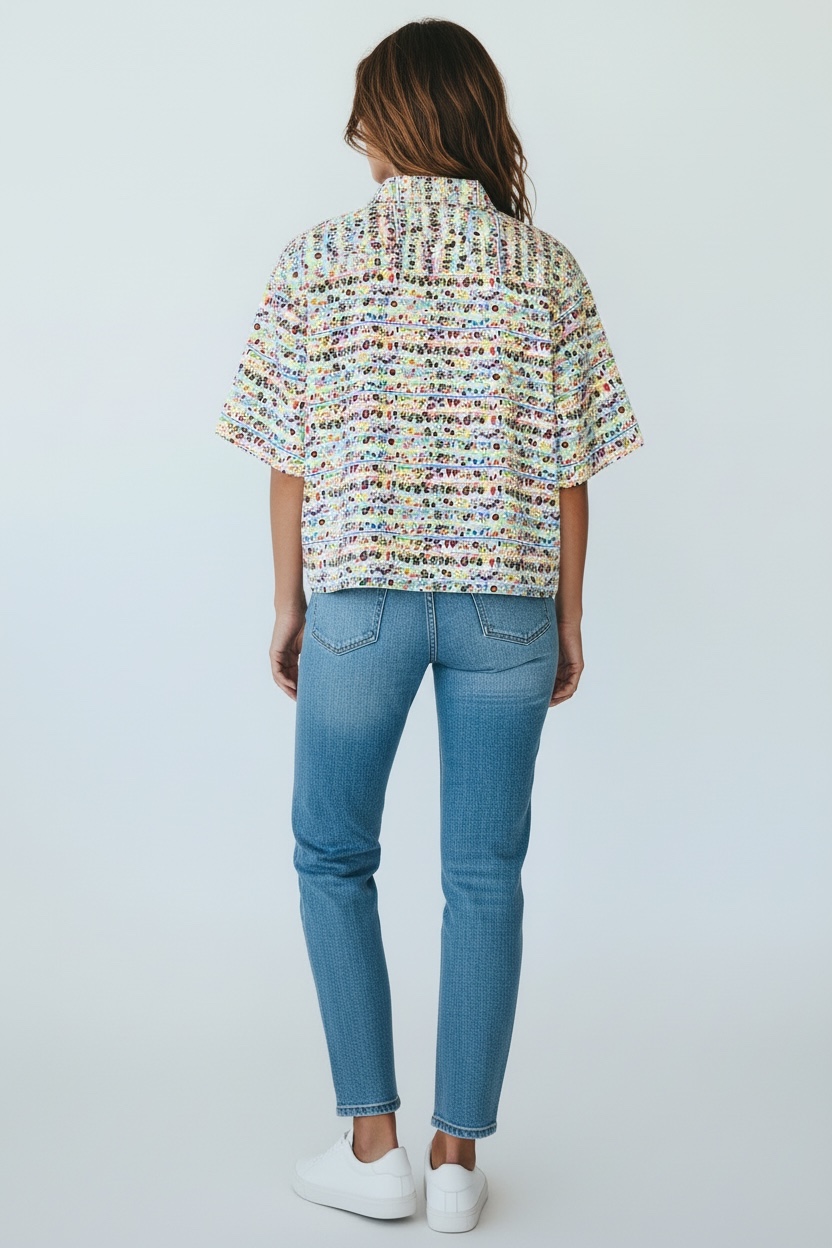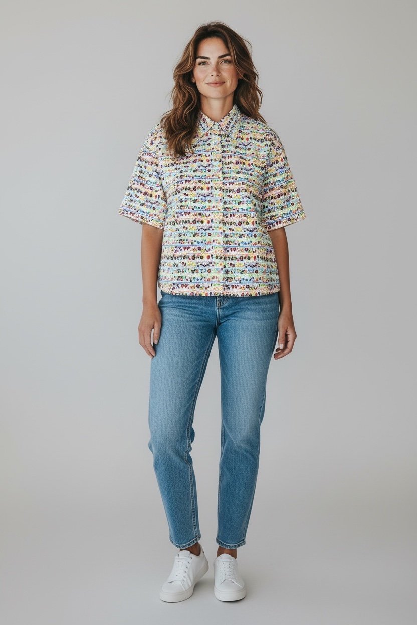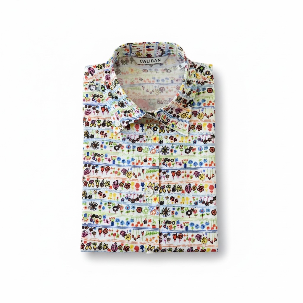 La Camicia Fantasia CALIBAN, è una camicia in cotone elasticizzato a fantasia, vestibilità a scatola, manica corta, colletto con bottoni e fila di bottoni centrale.