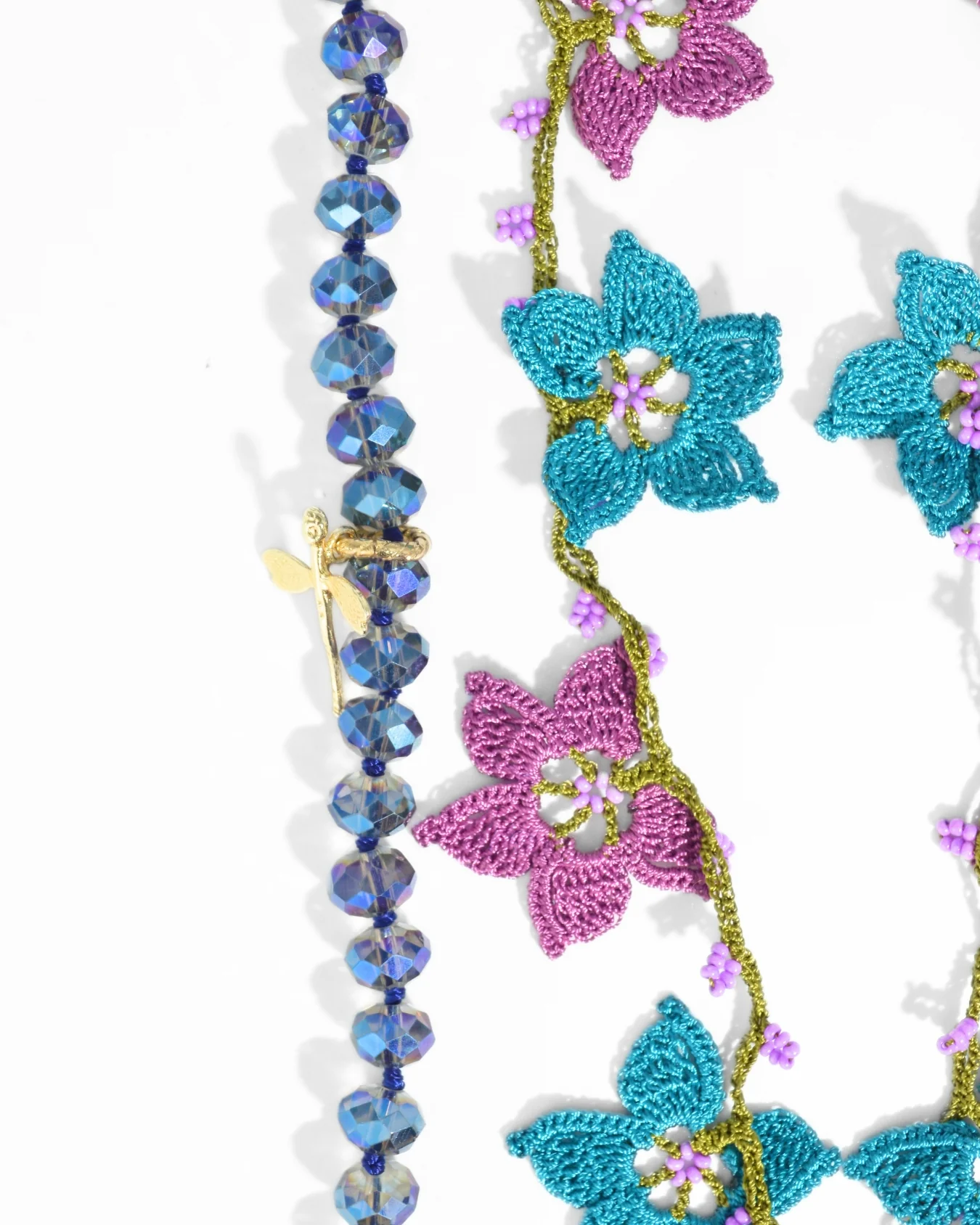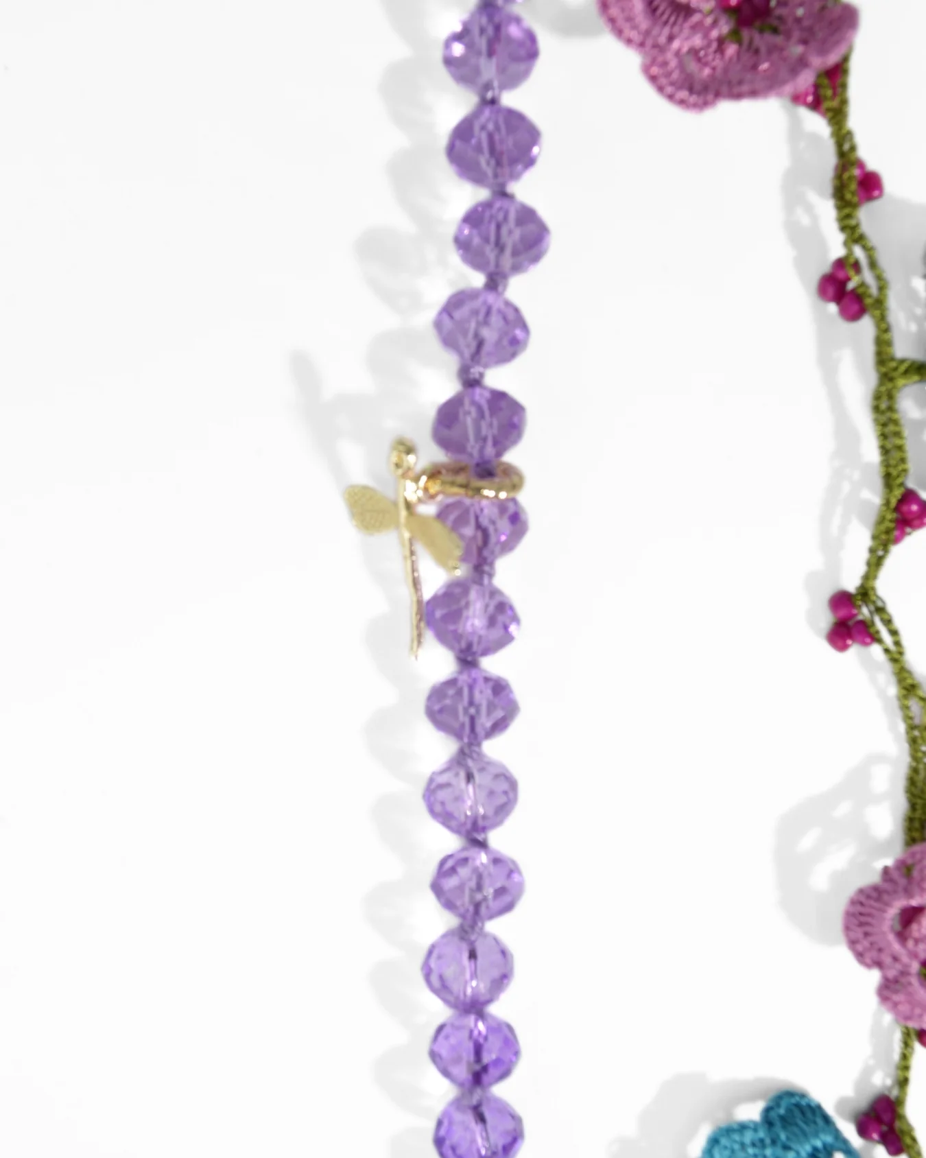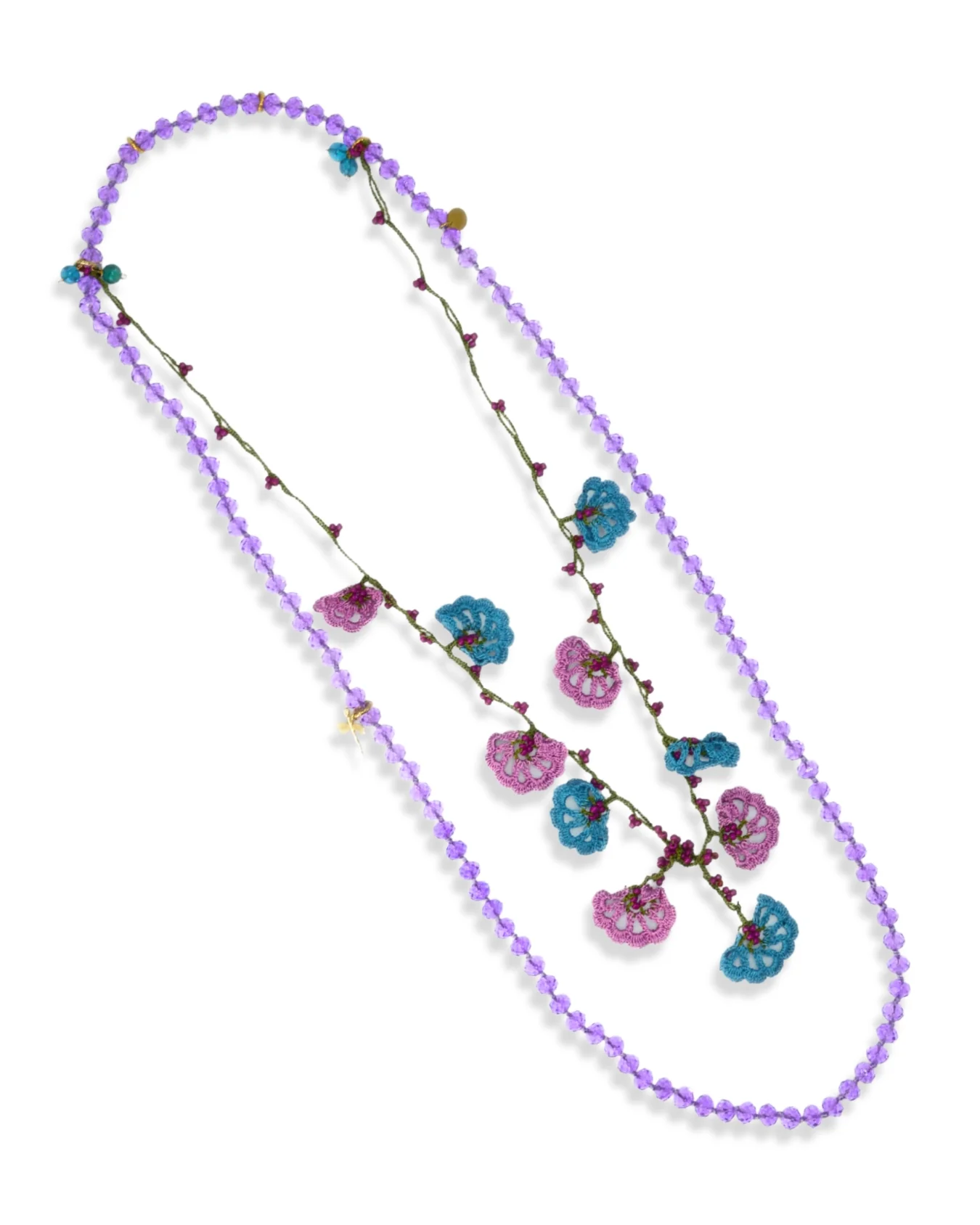 - Collana all’uncinetto con fiori in filo abbinati ai colori delle perline