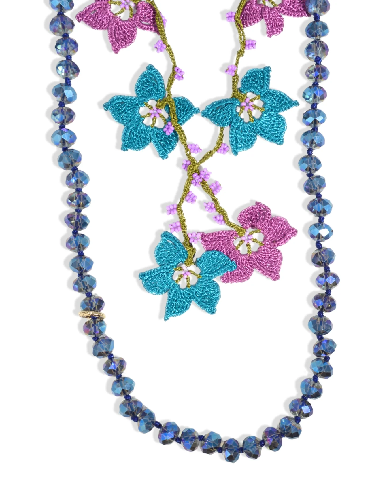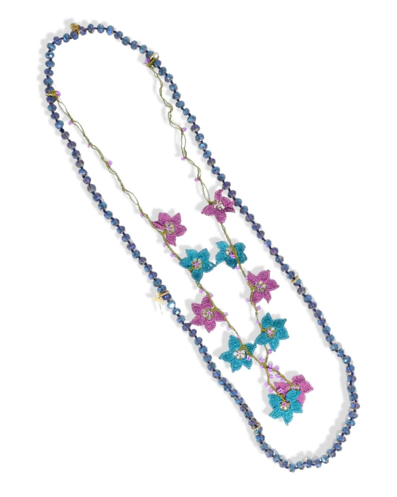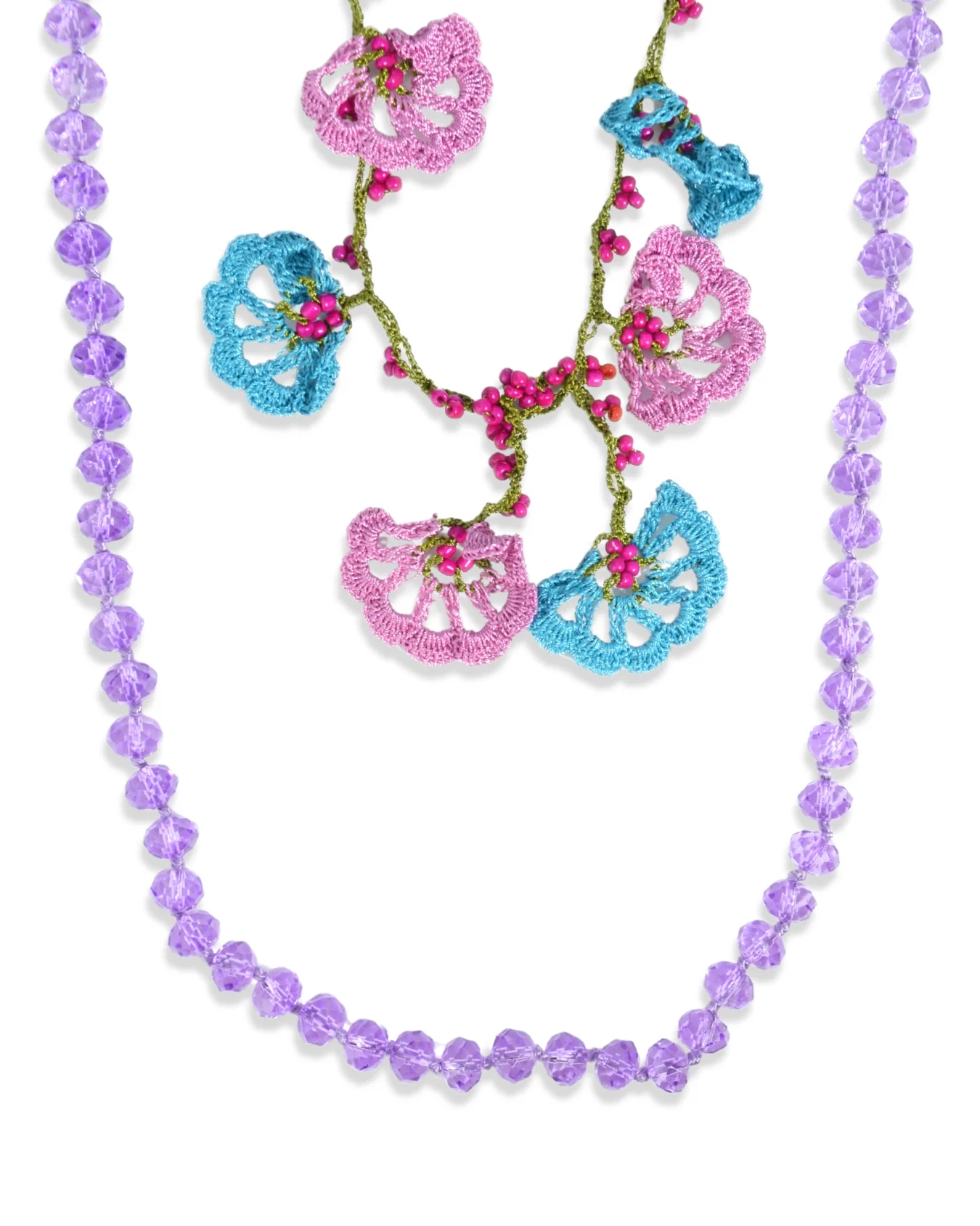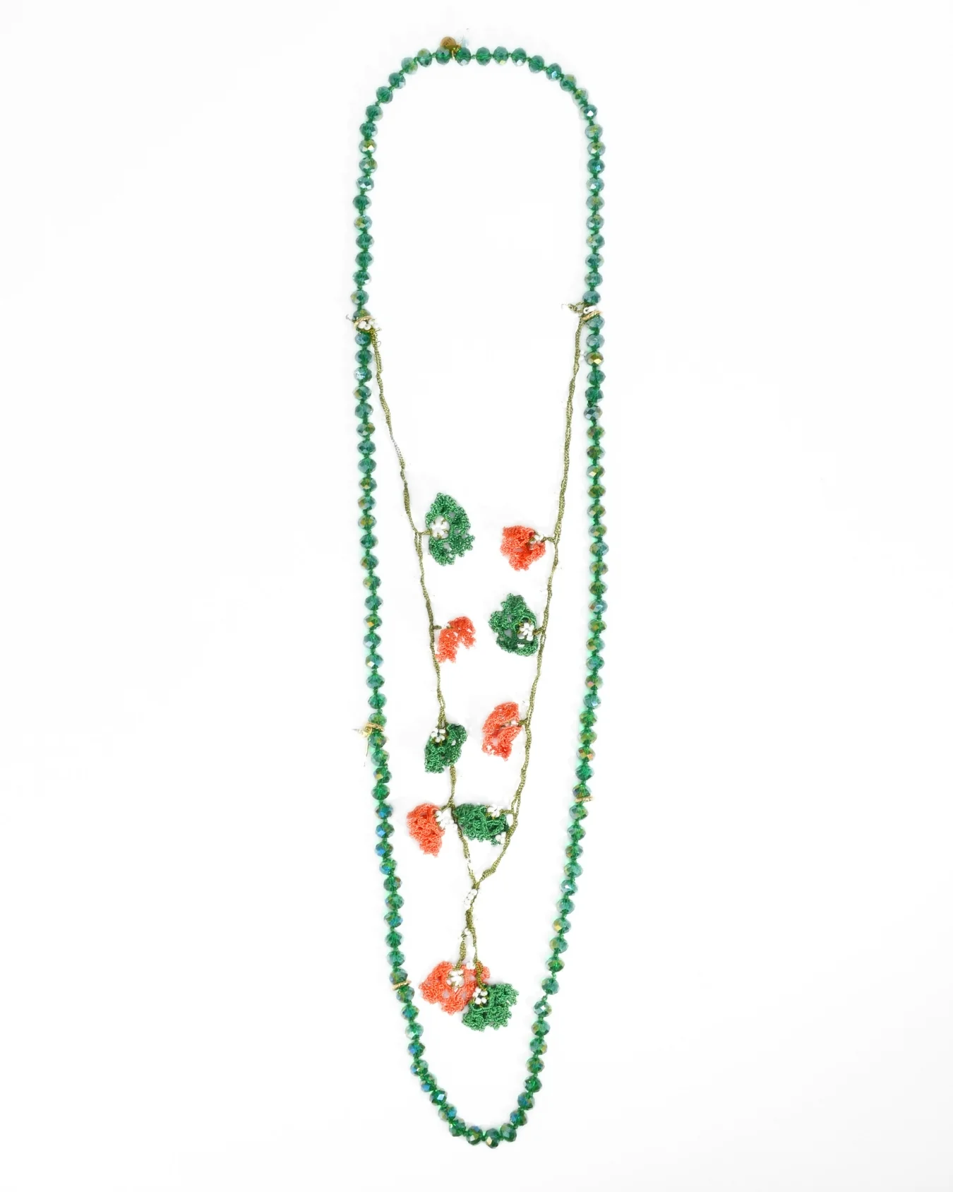 - Collana all’uncinetto con fiori in filo abbinati ai colori delle perline