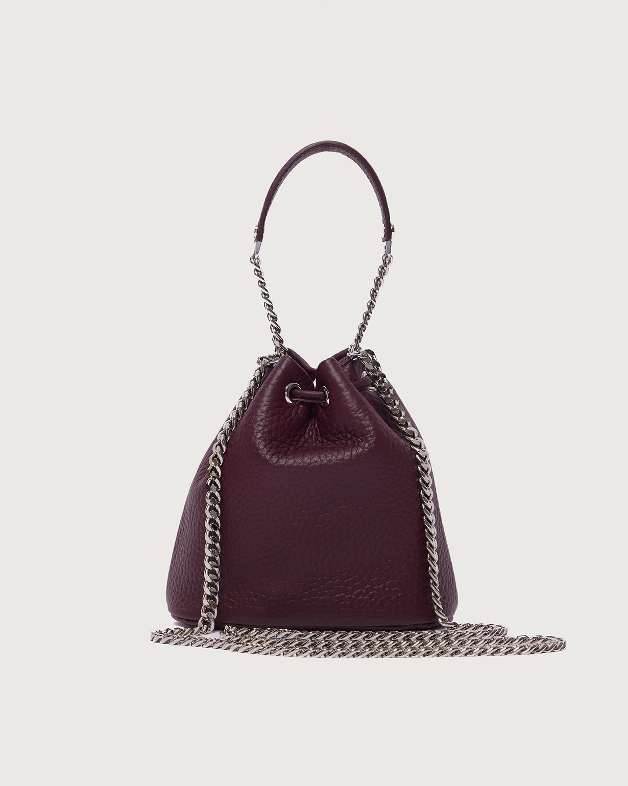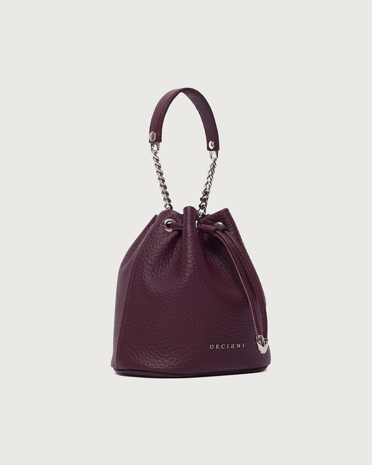 Il Mini Secchiello Nest Soft ORCIANI, è una borsetta in pelle martellata con laccetto, rifiniture palladio con tracolla a catena aggiuntiva.