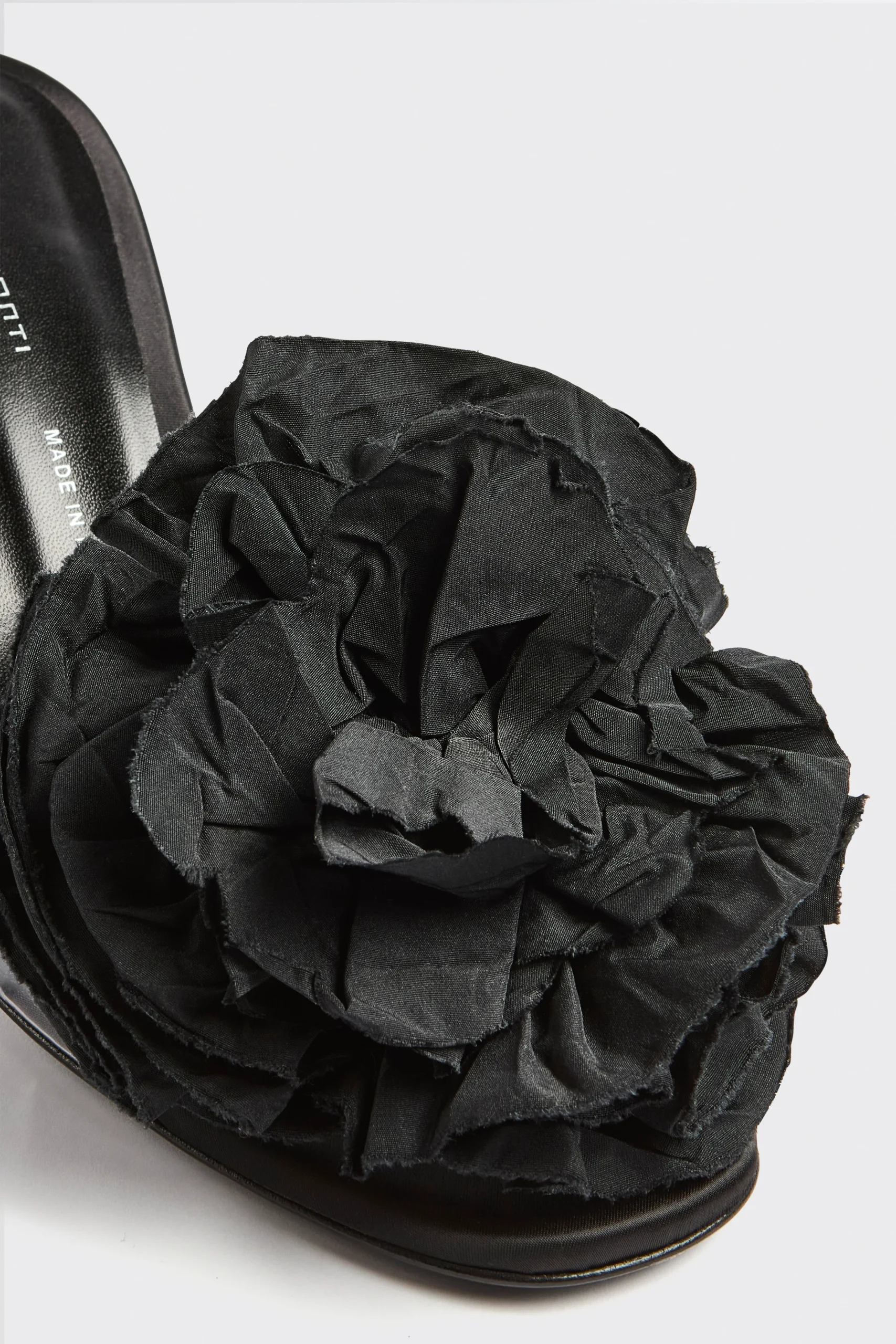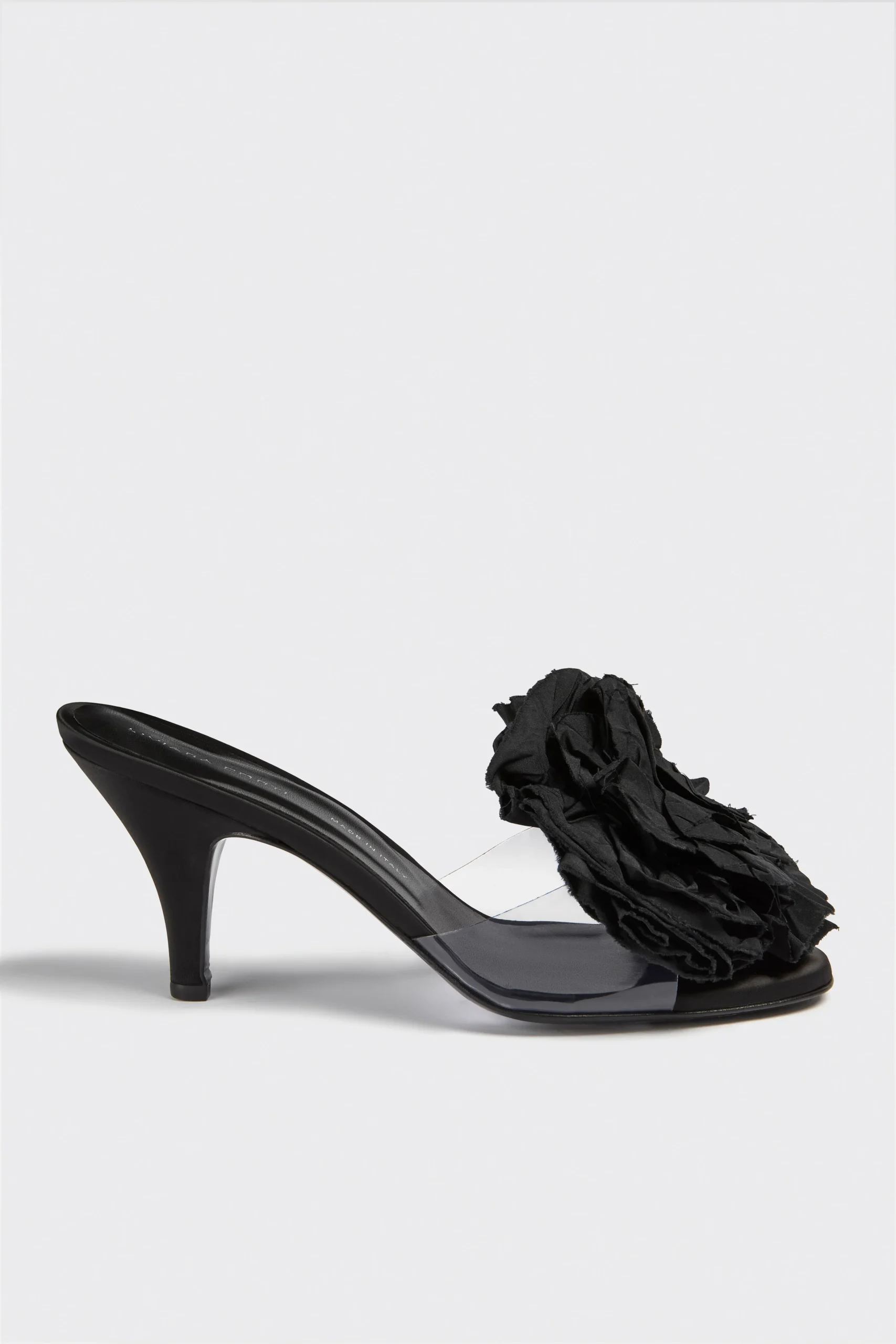 Mules Wanda LIVIANA CONTI, con applicazione dettaglio floreale in raso, fascione trasparente plasticato, fondo cuoio, tacco 80 mm.
