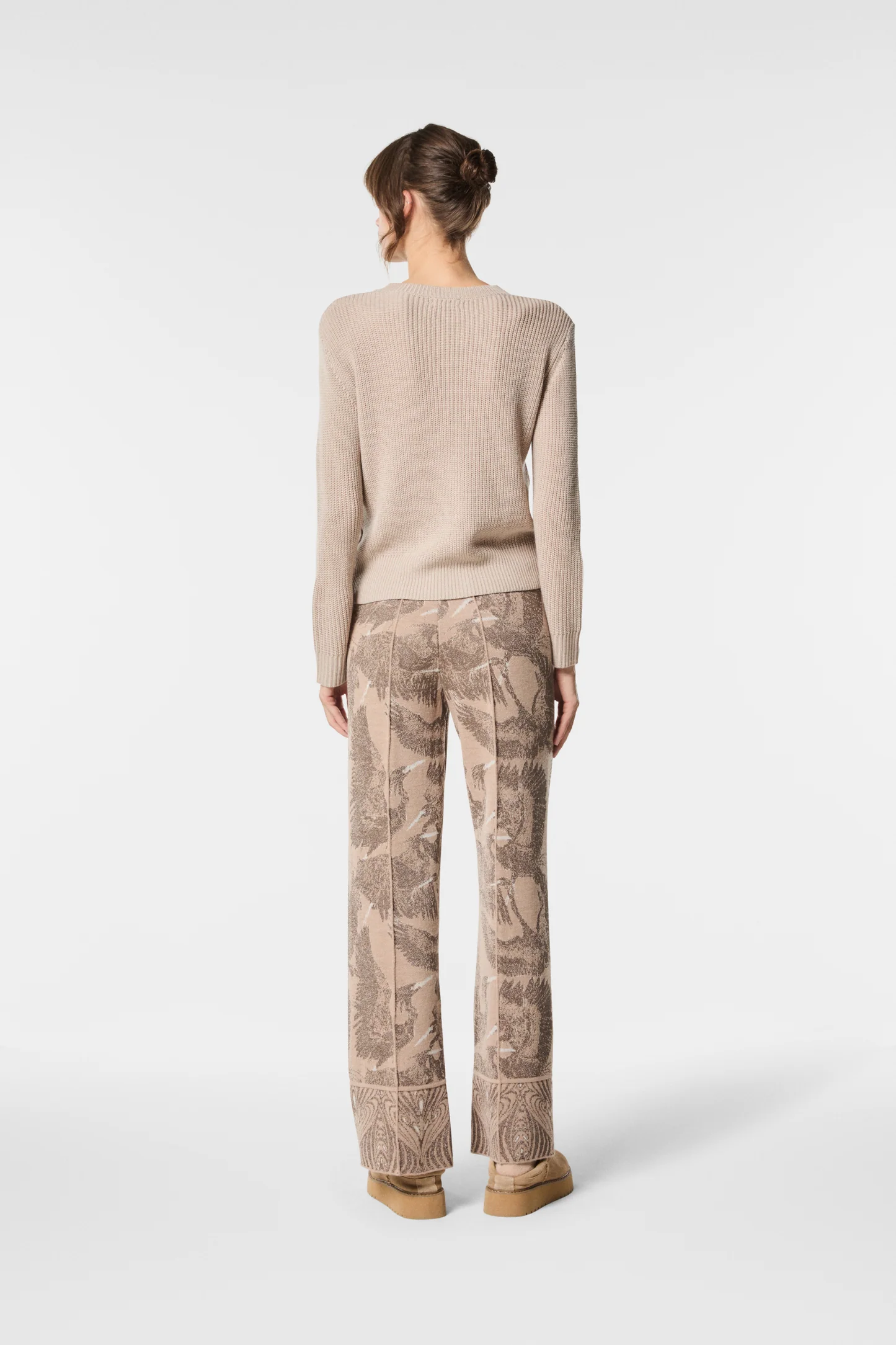 Il Pantalone Yak NENETTE, è un pantalone in maglia jacquard con raffinato motivo orientale, che unisce comfort e stile. La texture morbida e la fantasia ricercata valorizzano la silhouette, rendendolo perfetto per creare look casual-chic dal fascino sofisticato, ideali sia per il tempo libero sia per occasioni più eleganti.