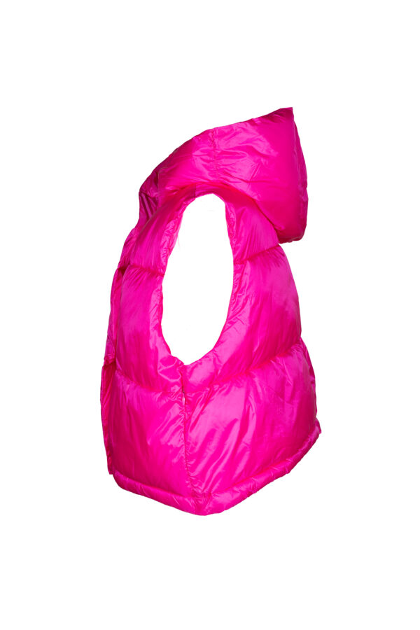 Il piumino smanicato LIVIANA CONTI, è un piumino satin corto con arricci in vera piuma d’oca, smanicato, collo alto, chiusura centrale tramite zip e lunghezza alla vita.