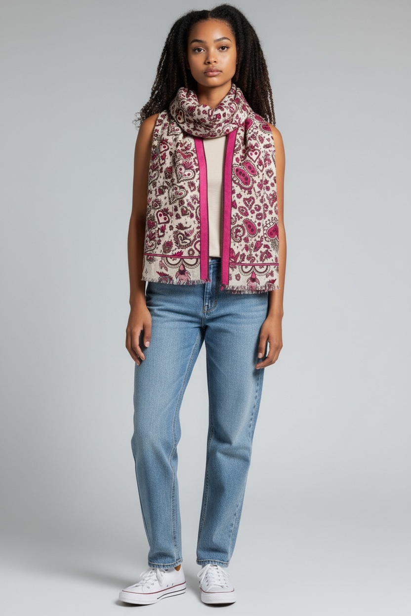 La Sciarpa Mexico PYAAR, è una sciarpa in cotone/lino stampata, ricamata con paillettes e sfrangiata a mano sui lati corti.