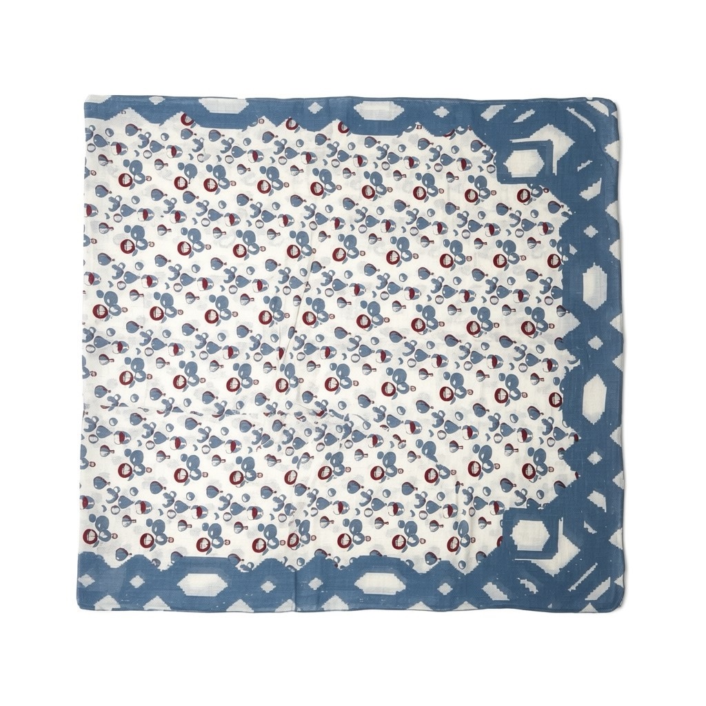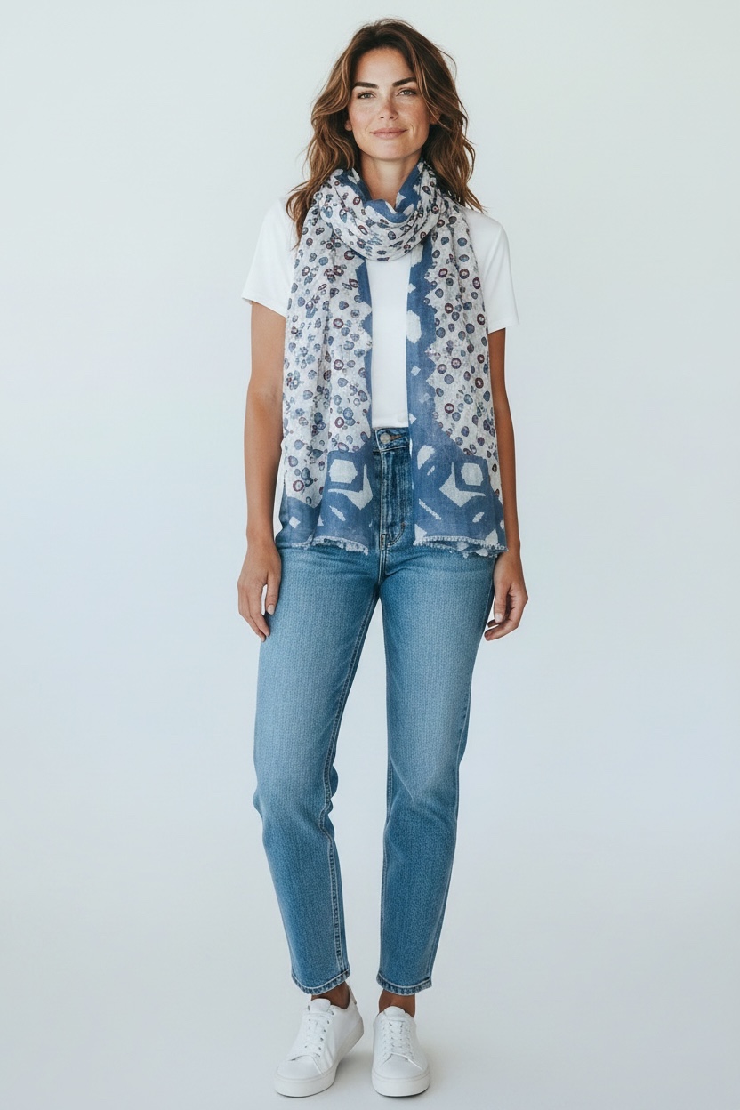 La Sciarpa Mongolfiera PYAAR, è una sciarpa in cotone e lino, con stampa digitale, sfrangiata a mano sul lato più corto.