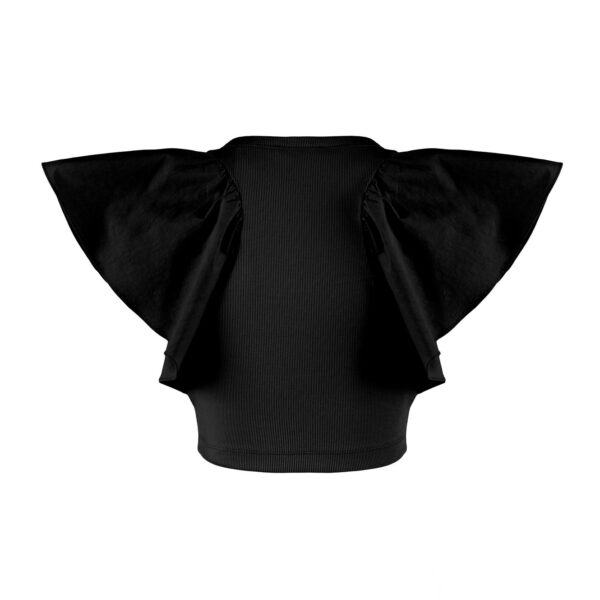 La T-shirt Discoteque NENETTE, è una t-shirt corta in cotone elasticizzato, a costina con maniche volant.