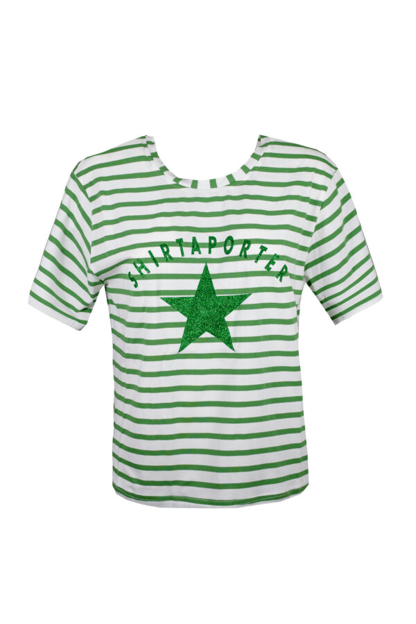 La T-shirt righe Logo SHIRTAPORTER, è una t-shirt corta a righe mezza manica con scollatura a V posteriore.