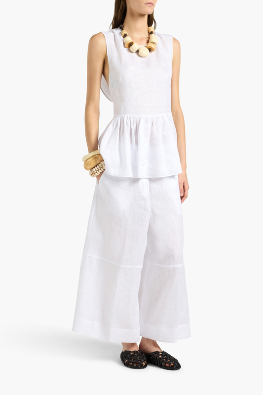 Il Top Harriett LIVIANA CONTI, è un top con rouches al fondo in 100% lino. Scollo tondo , taglio al punto vita. Linea sagomata, lunghezza ai fianchi.